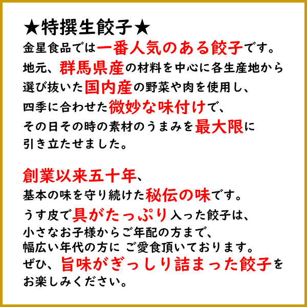 金星食品では一番人気のある餃子です。地元、群馬県産の材料を中心に各生産地から選び抜いた国内産の野菜や肉を使用し、四季に合わせた絶妙な味付けで、その日その時の素材のうまみを最大限に引き立たせました。創業以来五十年、基本の味を守り続けた秘伝の味です。