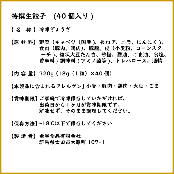 【原材料】野菜(キャベツ(国産)、長ねぎ、ニラ、にんにく)、食肉(豚肉、鶏肉)、豚脂、皮(小麦粉、コーンスターチ)、粒状大豆たん白、砂糖、醤油、ごま油、食塩、香辛料/調味料(アミノ酸等)、トレハロース、酒精
