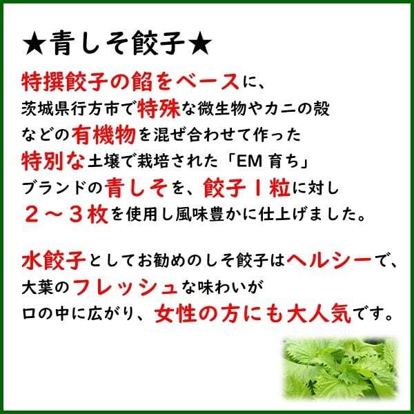特撰餃子の餡をベースに、茨城県行方市で特殊な微生物やカニの殻などの有機物を混ぜ合わせて作った特別な土壌で栽培された「EM育ち」ブランドの青しそを、餃子1粒に対し2~3枚を使用し風味豊かに仕上げました。水餃子としてお勧めのしそ餃子はヘルシーで、大葉のフレッシュな味わいが口の中に広がり、女性の方にも大人気です。