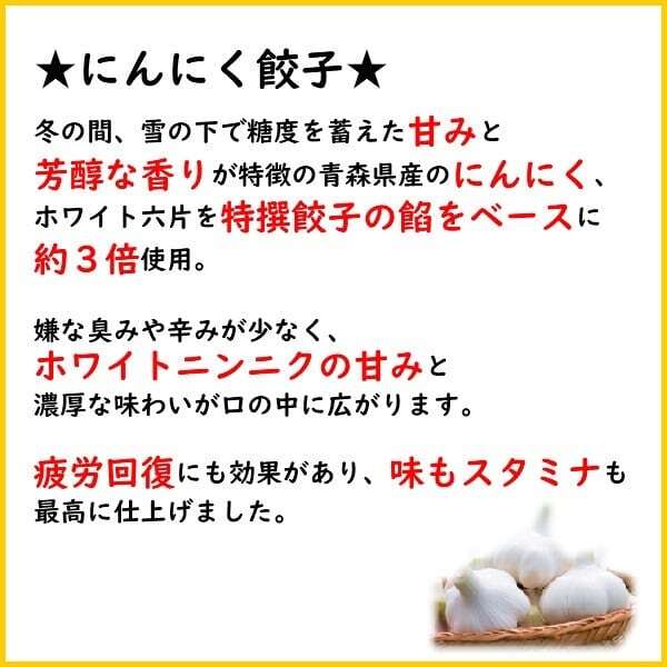 冬の間、雪の下で糖度を蓄えた甘みと芳醇な香りが特徴の青森県産のにんにく、ホワイト六片を特撰餃子の餡をベースに約3倍使用。嫌な臭みや辛みが少なく、ホワイトニンニクの甘みと濃厚な味わいが口の中に広がります。疲労回復にも効果があり、味もスタミナも最高に仕上げました。